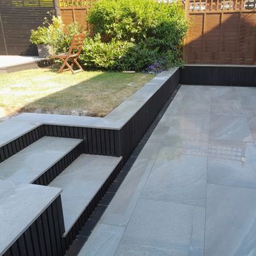 Using a beautiful porcelain slab with complimentary composite cladding we created an outstanding garden entertaining area